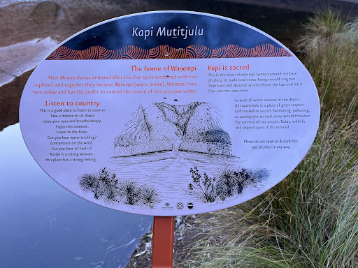 Read moreThis is on the Kuniya Walk and it is a nice spot being one of the few permanent water sources in the area. So it has trees and plants and must have been a sacred place for the Anangu people, the traditional Aboriginal Custodians of the land. Here as elsewhere on the walk there are caves with ancient rock art about the creation story of Kuniya the woma python woman, and Liru, the poisonous...