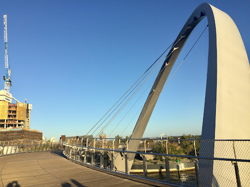 The design of the bridge itself is elegant and modern, curving gracefully over the water and linking the Quay area with the South Perth side. It’s wide enough to accommodate both pedestrians and cyclists, and it’s well-maintained with smooth, clean paths—ideal for runners. The views from the bridge are especially lovely at this time of day, with the skyline on one side and the expanse of the river on the other. You might even spot rowers or early ferries quietly gliding by.