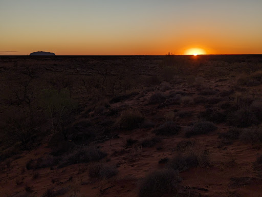 The vantage place to be - for Sunrise over both Uluru on right at a distance & Kata Tjuta (Many Heads) - the Olgas domed formations on the left which is closer. Weather Gods must be benevolent & so they were on 30July23 recently. Steel raised walkway from free large parking area - upward incline for about 150-200 metres which stretches over the striking desert scrubs, shrubs & arid grasses.