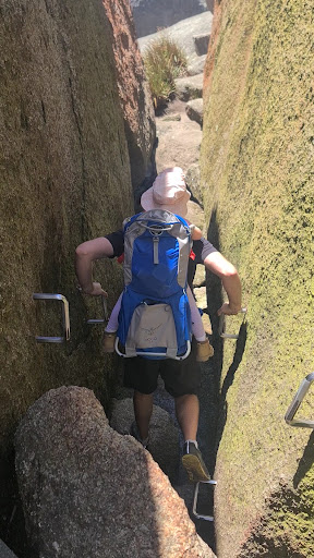 Read moreInfo for those going up with young children: it's a 2.2km hike up with rocky steps. Gradient isn't terrible but it is all up. At the top you get to the rock perched precariously (actually a tor so super stable), and you only go a few more metres before the trail splits. To the left is the Karri lookout - a flat metal board walk that anyone can do. To the right is the skywalk which is the real challenge. There is a section where you climb up using handholds - going up isn't too hard but if you're baby wearing it's harder on the way down (send someone else down first to help). Next there's a small flat section with views, then another climb using handrails - this is a little trickier as the hand hold aren't really where you want them to be. Each climb is only a few metres but challenging. Finally there's the 6m ladder - it's simple enough for adults (my husband had an osprey carrier with our toddler in it and I wore the baby), just might be a challenge for small kids on their own as they are rounded rails rather than flat steps. The skywalk is beautiful but if you are scared of heights or nervous about rock climbing with a kid on you it's still worth the hike to the Karri lookout. Toilets are just at the bottom and it takes a decent few hours if you're going toddler paced (took us an hour and 20 up). We did it at 25 degrees and wouldnt want it too much hotter. Photos are of the first hand holds looking up, husband climbing looking down, the ladder, then a video of husband climbing the second section (he's climbing down, this is before...