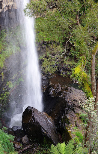The waterfall is around 25 metres tall, dropping over a sheer cliff cloaked in vegetation, with man tree ferns along the course of the creek.