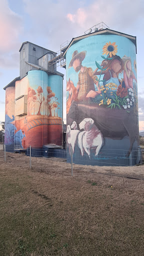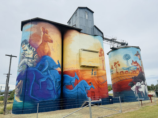 The colourful Quirindi silo art was done by artist Peter Ryan, who was inspired by the area’s history. Starting with the tree goanna, Yurrandaali, the totem animal of the Liverpool Plains, the story depicted on the three silos continues into colonisation with the land impacted by railways and agriculture. What is unique about this particular piece of silo art is that they have a night-time show, where you can pull up in your car, tune your radio to a particular station (88.6FM), and get a soundscape to match the projections. The show takes place at 7pm, and at 8.30pm until the end of Daylight Savings Time. There are also shapely benches that you can snaffle for the show that are arranged facing the silos. Parking is...