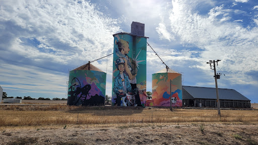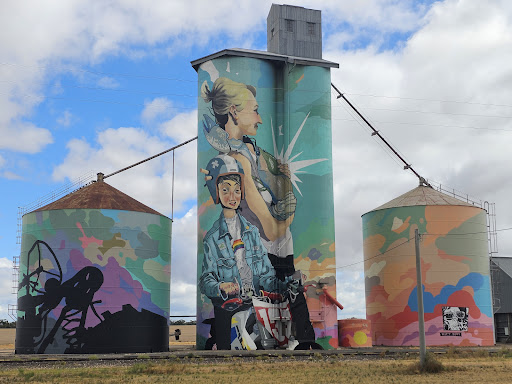 Read moreA quirky modern piece of art that expresses the joys of growing up in the country. The young lad on his motorcycle and his mum cuddling a giant yabbie are brilliant. This is still a working set of silos so please respect the signage and the private property and view only from the dedicated parking area...