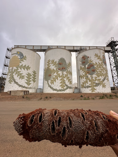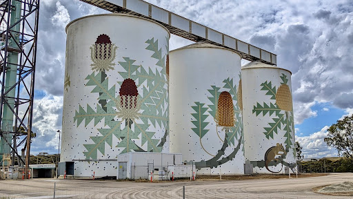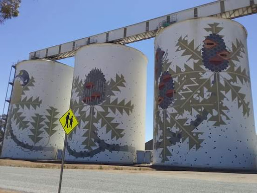 Read moreI love the artwork on the silos. Here at Ravensthorpe the theme is of thistles with leaves in a lovely sage colour. I don't know if thistles grow here or if there's another connection. They look great though and you can can get really close up...