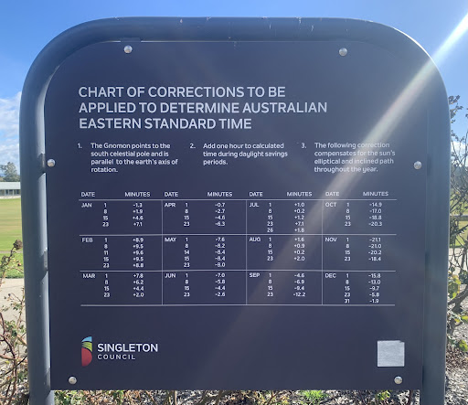 The Singleton Sundial is the largest sundial found in the southern hemisphere. The sundial was handed to the people of Singleton on the 20th of March, 1987, along with a certificate from Guinness Book of Records as been the largest sundial in the world at that time. The sandstone retaining wall at the base is constructed from convict hewn street stones from Singletons early history.