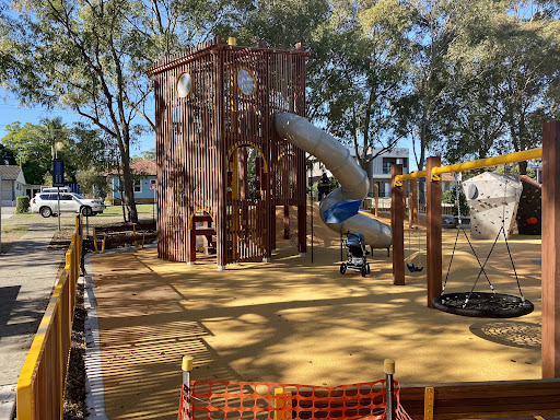 Nice park, recently renovated. Slide, balance beams, rope bridges, swings, climbing walls, bouldering setup, public toilets, walking track and half court to shoot some basketball 🏀 hoops, public toilets and quite shaded. The park itself is semi fenced so a little more safer for the smaller kids. There are covered bench seats around the park with park bench and tables near shared bbq areas and bins. All of this over looks a soccer field with a...