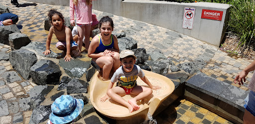 Water play area to be avoided. The rest is pleasant park/playground and picnic but try keeping little kids away from the water. Anxious parents and grandparents on tender hooks supervising kids and aware of how badly designed this area is. Trip hazards, slip hazards, all hard surfaces, bricks. Parents commenting on how dangerous and poorly designed it is.