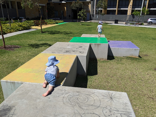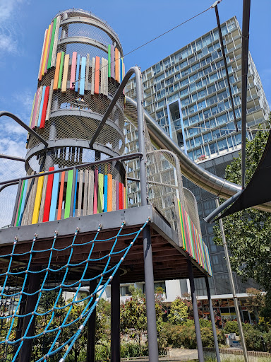 Awesome long giant slide dominates this playground! This is an adventure playground and is a child-friendly park featuring designs by Sydney artist Nuha Saad. There are picnic and barbecue areas, there are bike racks, and handball areas, including a table tennis table. The picnic and barbecue areas are perfect for cooking up snags, burger patties and steaks. There are also public toilet facilities very close to the playground. There are some street parking available as the playground is surrounded by apartment buildings.