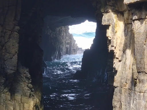 The best time to arrive is low tide, when the ocean has pulled back far enough for you to step through the twin-arched tunnel and stand on damp sand while waves boom outside the far opening. Look up before you leave, the outer arch neatly traces the shape of Tasmania against the sky, a quirky detail carved by centuries of surge and spray.