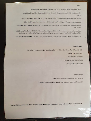 Read moreWe decided to drop by to fill some time up in Phillip Island, not really knowing what to expect. The venue for lunch is quite quaint and stylish, with a nice ambience. The staff were very attentive and pleasant, however we felt our waitress was a little too pushy or in some sort of rush when it came to asking us three times after being seated if we wanted a drink. We hadn’t had time to even look at the menu before the first approach. We had a shared platter, salad and arancini balls. The salad wasn’t really a ‘salad’ but rather a few slices of tomato and mozzarella neatly stacked with some basil thrown on top - it was however delicious (just not what we were expecting) and we were slightly disappointed with the platter as there was very little amount of cheese provided and the meat wasn’t too interesting. I was also super confused by the drinks menu as it seemed to be other people’s wines? I wasn’t sure what theirs was. It was probably there, but again I felt rushed needing to order something.