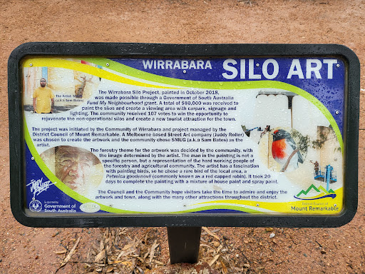 Wirrabara Silo Art is part of Wongabirrie Park and the art silo is a stunning display that has to be seen to be appreciated as there are many little secrets in the art work that aren't always obvious. There has obviously been a lot of thought snd hard vwork put in by the community in developing the site with fencing, picnic tables, separate parking for buses and cars etc, sculptures The recent installation of lights are an added bonus; a 'local' said the silo looks beautiful at night.