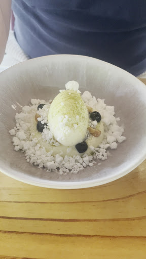 Paired Seasonal Lunch: We had the 6 course seasonal lunch menu with paired wines. All of the food and wine was exceptional and our waitress Marina provided both compliments and service of the highest quality. Started with sourdough with cultured butter and a Chef’s canape which was inhaled thus didn’t get a chance to take a photo. First course was a Scallop Crudo which was delicate and light paired with a Riesling. Second course was Stracchino paired with a Sauvignon Blanc. Third course was Fish paired with a Chardonnay. Fourth course was Margaret River wagyu with was tender and buttery paired with a Cabernet Sauvignon. Fifth course was a dramatic blueberry dish. Sixth course was the Cambray reserve cheddar with cornbread and spiced raisin. An interesting interpretation of a cheeseboard which was light and delightful to the senses.
