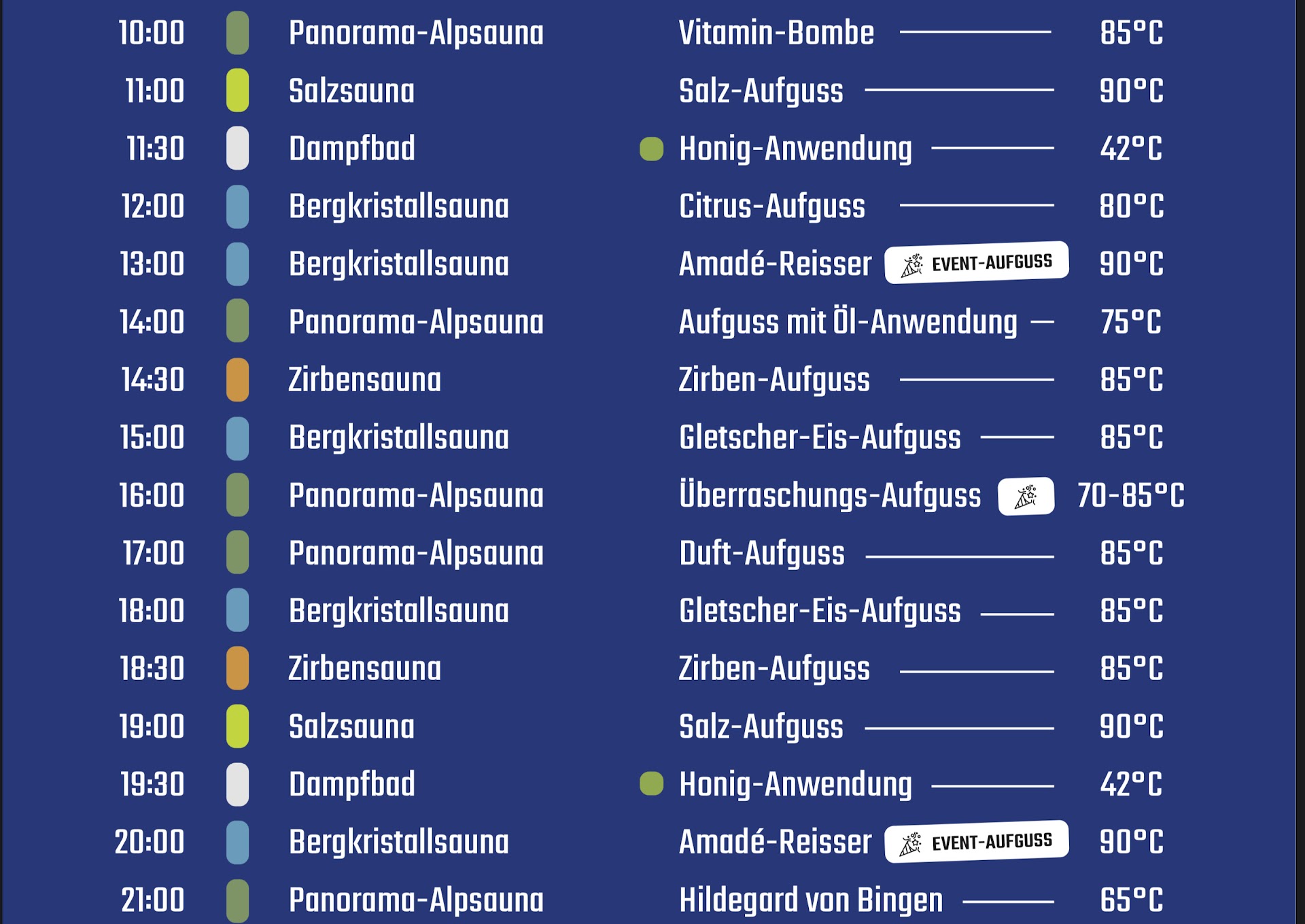 The sauna masters at Therme Amadé are true Aufguss maestros! We usually arrive before 18:00, as the sauna area requires an additional ticket valid for four hours. During our visit, we typically attend three to four sauna ceremonies. The highlight is the signature ritual, Amadé Reißer, at 20:00 (check the attached schedule for details). It’s intense—hot as hell—but absolutely unforgettable. If you’re new to sauna culture, I recommend sitting on the lower level, where the heat is milder.