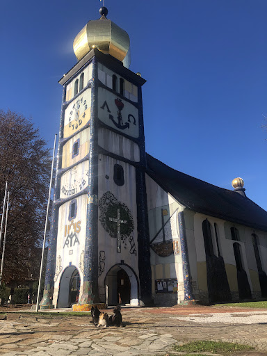 Diese Kirche muss man einmal gesehen haben, zumindest um zu erkennen, dass die Idee von Hundertwasser, sich nicht von geraden Linien gefangen halten zu lassen, absolut unmöglich an einem klassischen Kirchenbau umzusetzen ist. Da haben Andere es weitaus besser geschafft, die strengen Strukturen einer Kirche aufzulösen und gerade Linien zu unterbrechen. Das was man hier sieht, ist ein typischer Kirchenbau mit Turm und Schiff, streng den üblichen geraden Linien unterworfen, nur eben mit bunten Elementen, Kugeln und sonstigem semi-religiösen Firlefanz aufgehübscht. Die "bösen" geraden Linien am Turm wurden mit Wülsten verkleidet, was aussieht, als hätte man den Kantenschutz vergessen abzumachen, nachdem man das Puppenhaus aus der Verpackung genommen hatte. Ich muss gestehen, dass ich weder ein Freund des Katholizismus bin, noch ein Fan von Hundertwasser. Aber es ist unschwer festzustellen, dass diese Kirche nicht schön ist und sowohl der katholischen Architektur als auch dem Hundertwasser-Manifest als ein Schlag ins Gesicht aufzufassen ist.