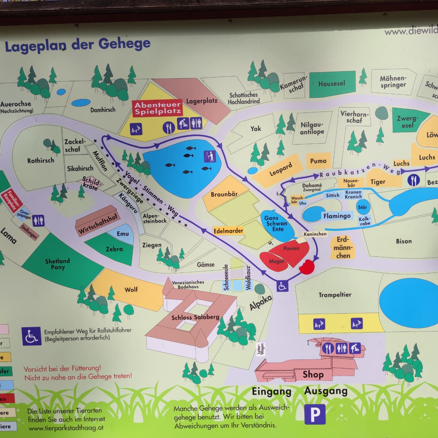 War diesen Dienstag zum ersten Mal hier. Mitten unter der Woche, hatten wir wohl großes Glück, da wir den ganzen Vormittag über, fast allein dort rumspazierten und draußen nicht anstehen mussten. (Älterer Herr an der Kassa sehr unfreundlich) Herrliche Natur, viele Sitzgelegenheiten, viele Bäume, viele Schattenspender, mehrere Desinfektionsspender. Alles recht gepflegt, alle Mistkübel geleert. Mein Kind konnte also ungestört überall in Ruhe füttern (Futterbeutel zum Kaufen) und war ganz begeistert von den vielen Tieren, die sich an diesem Tag alle zahlreich zeigten und total zutraulich waren. Dass es überwiegend einheimische Tiere wie Schafe, Pferde, Ziegen, Kühe, Gänse, Enten, Esel, Steinbock, Rehe, Hirsche, usw. sind, sollte man vorher vielleicht wissen da man sonst enttäuscht sein könnte. Diesen Park kann man nicht mit Schönbrunn oder anderen vergleichen da es hier auch keine Terrarien oder außergewöhnliche Exoten gibt. Es ist ein großer Erholungsort mit Streichelzoo und einem fantastischen Spielplatz für Groß und Klein, weshalb er für Familien mit Kindern besonders gut geeignet ist für einen Tagesausflug. Wir freuten uns, dass wir uns hier nicht extra testen lassen mussten, vorher. Wir freuten uns auch über die vielen Sitzgelegenheiten wo wir unsere mitgebrachte Jause – und das Essen aus der Kantine dort konsumieren konnten. Die praktischen Leiterwagen zum Ausborgen für Kinder und Taschen nahmen wir nicht in Anspruch, weil die Wege teilweise schon ganz schön bergauf gehen, weshalb es auch für einen Rollstuhlfahrer ohne Begleitung oder schwerere Kinderwagen vielleicht etwas mühsam sein könnte. Die Löwen taten mir extrem leid, weil ihr kleines Revier irgendwie total langweilig aussieht, ohne Anreiz für Versteck- oder Spielmöglichkeiten. Auch andere Gehege sind nicht sonderlich spannend ausgestattet, alles ganz schlicht. Aber die Tiere tun mir generell immer leid, auch in...