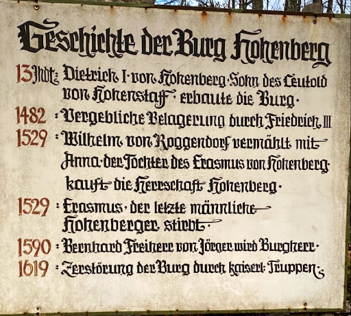 Burgruine Hohenberg. Parken in der Ortschaft beim Tennisplatz. 20 min auf Forstweg. Erbaut im 13 Jh. Teilweise Gesichert aber wieder überwachsen. In der Vorburg sind Resten von einer aussen Mauern mit Torturm, Zwinger , neben Gebäuden und Zisterne. Die Hochburg mit Reste von einem Gebäude (Kemenate) und Überreste des Bergfrieds. Hinter der Hochburg geht die Ringmauer kreisförmig weiter und verbindet einen Wehrturm und Bastion. Um hierher zu Gelagen muss man sich durch das hohe Grass und Gebüsche kämpfen. Die Ringmauer führt weiter und endet wieder über der Vorburg und dem Zwinger. Schön Anlage. Aber wieder mal Zeit die Pflanzen...