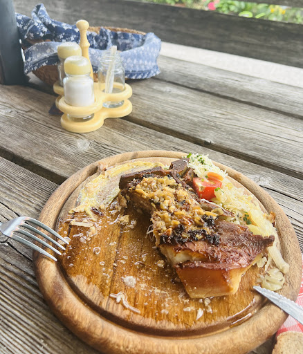 Besonders empfehlenswert ist das für die Region typische Bauernbratl. Es ist gut gewürzt, mit Knoblauch verfeinert und wird klassisch mit Knödeln und Kraut serviert. Bei unserem Besuch haben wir uns für die „Jausen“-Variante entschieden – ein lauwarmes Bratl mit Kren, Krautsalat, Senf und frischem Bauernbrot. Eine leichte und schmackhafte Option, gerade an warmen Tagen.