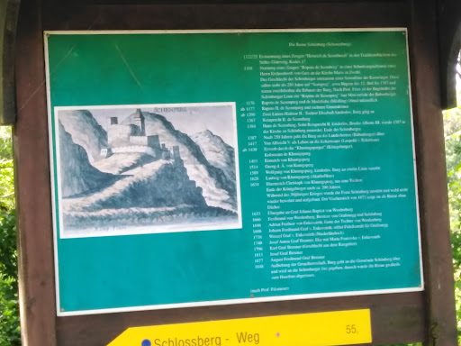 Am Schlossberg hoch über Schönberg am Kamp befinden sich die spärlichen Reste der einstigen Burg aus dem 12. Jahrhundert. Die Feste wurde bereits 1372 und 1378 belagert und teilweise zerstört, jedoch wieder aufgebaut. 1645 wurde die Burg von den Schweden teilweise zerstört und nicht wiedererrichtet. Endgültig vernichtet wurde die Anlage jedoch ab 1778, als die Bewohner der Umgebung die Gebäude abtrugen, um Baumaterial für ihre Häuser zu gewinnen. Die Zerstörung der Burg war so gründlich, dass heute nur mehr einzelne Mauerreste vorhanden sind. Größter erhaltener Bauteil ist ein Stück der Ostwand des Palas. Außerdem findet man noch zwei intakte Gewölbe. Auch wenn heute lediglich nur mehr Fragmente der einstigen Wehranlage vorhanden sind so ist ein Besuch dennoch lohnend und vom ehemaligen Burghof bietet sich eine wunderbarer Ausblick...