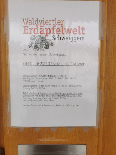 Die Ausstellung findet man im Rathaus von Schweiggers. Dazu muss man erstmal in den ersten Stock um sich die Keykarte für das im Keller befindliche Museum zu holen. Die beiden Mitarbeiter im Büro waren sehr freundlich und aufgeschlossen. Die Ausstellung über die Kartoffeln selbst ist hingegen nur für wirklich Interessierte empfehlenswert. Kinder haben hier bestimmt nicht soviel Vergnügen. Mit dem Audioguide - den es kostenlos dazu gibt, erfährt man jede Menge über die Knolle. Im Ausstellungsraum befindet sich auch ein kleiner, seperater Bereich in dem man Filmmaterial gezeigt bekommt. Alles in allem ein interessanter und lehrreicher Ausflug. Es ist noch zu erwähnen, dass man auch das Heimatmuseum besuchen kann, welches sich ebenfalls im Rathaus befindet. Man braucht hier keinen extra Eintritt zu bezahlen - dies gehört zur Erdäpfelwelt dazu. Auch der Audioguide weiß hier viel zu erzählen. Aber auch das ist noch nicht alles - man erfhärt auch jede Menge über die Geschichte, wenn man doch die Hauptplatz-Tour macht. Auch hier kommt der selbe Audioguide ohne zusätzliche Kosten...