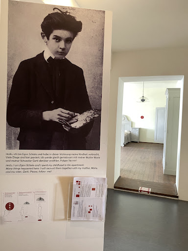 Read moreEin Ort, der bequemer nicht zu erreichen ist. Direkt im Bahnhof Tulln ist Egon Schieles Geburtshaus bzw. Geburtswohnung. Als Sohn eines Bahnhofsvorstehers erlebte er Tagein tagaus fahrende Züge, ankommende Menschen, abfahrende Leute. Die Wohnung selber wirft nochmal ein ganz anderes Bild auf den Künstler und erklärt vieles. Man geht in die Wohnung hinein, indem man in einen Zahlkasten 2 EUR zahlt. Dann öffnet sich eine Stahltür und man steht in einer anderen Zeit. Großartig!...