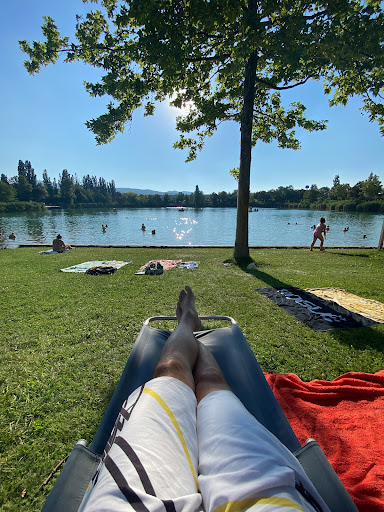 Man hat die Wahl zwischen Stegen, die gibt es sehr viele rund um den See oder die große Wiese am anderen Ende vom See. (wenn man beim Eingang herein kommt). Da sind auch zwei überdachte Sandkisten für die Kinder, ein Spielplatz, ein Imbiss (nicht immer geöffnet) und eine Trinkwasserstelle. Ebenfalls Toiletten und Kabinen zum umziehen.