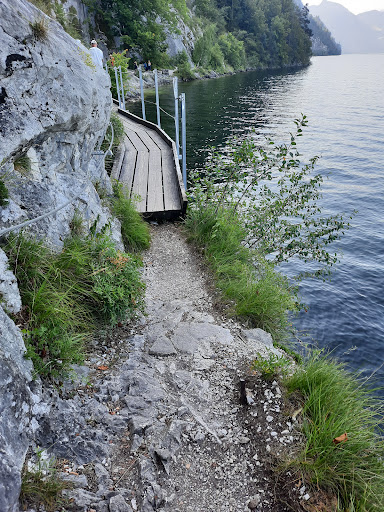 Wunderschöner Kletterweg ( ca. 1,5 km ) entlang des Traunseeufers unterhalb des mächtigen Traunstein bis zum Aufstieg des Miesweg. Er heißt nicht umsonst Alpinsteig. Immer wieder sieht man jedoch Touristen mit Sandalen. Der Miesweg ist extrem schmal und ca. 1 km lang. Über große Steine bergauf, bergab sind Immer wieder Stahlseile zum Halten angebracht. Entgegenkommenden Kletterer kann nur schwer ausgewichen werden, der Weg ist stellenweise nur 1/2m breit. Auf dem gesamten Weg geht es fast senkrecht bis zu 10m in die Tiefe bis zum Traunsee. Zwei Stahlleitern mit ca 20 Stufen, und einigen angelegte Stahlbrücken befinden sich entlang des Miesweg. Im Mittelteil des Weges kommst Du bis ans Ufer des Traunsee. Dort sind Bänke zum Verweilen vorhanden und im Sommer lädt der See zum Baden ein. Bei Regenwetter kann man dort einen Wasserfall besichtigen. Für geübte Bergsteiger sind in den steil aufragenden Felsen Haken zum Klettern befestigt. Der Aufstieg erfolgt über steile Serpentinen auf über 150 Höhenmeter bis zur Forststrasse und dem Ende des 2. Tunnels. Auch ein Aufstieg auf den Traunstein (1.691) führt von dort weg. Durch die beiden Tunnels geht es wieder zurück bis zum Aufstieg des Miesweg und entweder über die Forststrasse, oder wieder entlang des Traunseeufers bis zum Parkplatz. Unterschätzt diesen Miesweg...