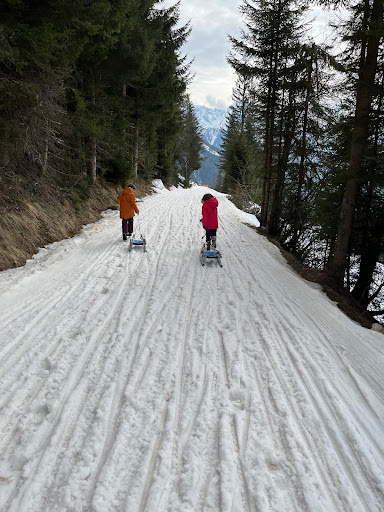We probably walked at least 2 km of the track as the double sledge would not run on the "prepared" track for large parts. There were quite a few large troughs in the path which either threw you off the sled or stopped it in its tracks. The run is also not really flood lit but more lit every 100 meters. This is fine when the snow allows for quick running of the sleds, but infuriating when you are stuck in a trough digging your sled out with faster running single sledges blasting by. That felt very dangerous and there were several crashes.