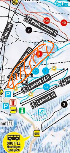 The ski area is easy to reach by train and by car. A big bonus here is that it already opens at 7:30am. I advice to be there before 8am. In the morning the ski runs are still fresh and enjoyable. Usually at around 10am more people arrive. The west facing ski runs tend to get really icy. If you want a scenic place for a lunch break, visit Wedelhütte.