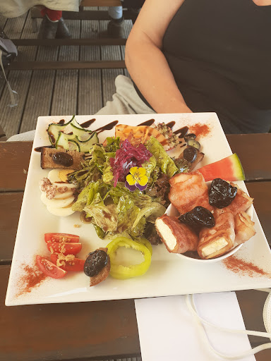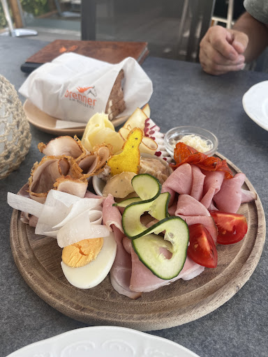 Was leider gar nicht ging: ich hatte extra angerufen und einen Tisch auf der Terasse reserviert, nach einer 40minütigen Anfahrt erklärte man uns, dass draußen nichts frei ist und ob wir nicht drinnen oder im Hof bei den Autos sitzen wollen. Da ich natürlich verneinte (hatte ja auch extra reserviert), baute man uns einen Klapptisch an der Hausmauer auf, von der eine extreme Hitze abstrahlte und ca. 100 Viecher herumflogen. Wir bestellten eine Bretteljause für 2 (was die Kellnerin anscheinend noch nie gehört hatte) und einen gemischten Salat. Nach der Aufklärung dass wir einfach 2 Bretteljausen wollten, wollte uns die Dame ein Saures Allerei (halt dann vegetarisch) um 9€ andrehen - gut, dass ich dann auf einen grünen Salat umgeswitcht bin, weil dass es keinen gemischten gibt, hat sie so nicht kommuniziert....