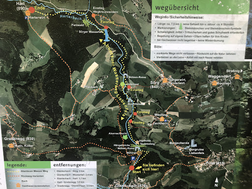 Eine fantastische Wanderung für die ganze Familie. Idealerweise für Kinder ab drei Jahren jüngere Kinder können gerne in einer Kraxen mitgenommen werden. Man parkt am Fuß des Abenteuer Wasserwegs. An Wochenenden sowie in der Hauptsaison bieten sich die Tage Montag und Dienstag an, da hier die beiden Jausenstationen geschlossen haben, sind auch weniger Gäste auf der Strecke. Hintergrund des Hinweis ist, dass der Parkplatz dann doch recht überfüllt ist. Das Parken an der Straße wird nicht gern gesehen, und von den Behörden mit Warnhinweisen geahndet. Man kann sich leicht ein Vesper mitnehmen, so dass man überhaupt keine Jausestation braucht, das Essen ist ohnehin ungesund und schmeckt auch nicht besonders. Der Anspruch bei beiden großen auf der Strecke beworbenen Jausestationen darf nicht besonders hoch sein. Ich möchte sie aber auch nicht schlechter machen als sie sind, wer großen Hunger hat findet sicher etwas und wird auch satt. Tolle Picknickeinrichtungen machen aber wie gesagt Jausenstationen entbehrlich, am plätschernden Bach auf einem der bereitgestellten Bänke mit Tischen lässt es sich wunderbar aushalten und die Kinder können nebenher am und im Bach spielen. Entlang der Strecke gibt es viele abwechslungsreiche Sehenswürdigkeiten, eine KunstAusstellung, tolle Auen, und im August findet man am Wegesrand auch die Früchte der Natur, Wald Himbeeren und Wald Brombeeren sind reichlich vorhanden. Für den Rückweg bietet sich noch ein Abstecher zur Burg Liebenfels an, die aktuell allerdings umgebaut wird, deshalb eben nur von außen zu sehen ist. Der Abmarsch bietet aber auch schöne Einblicke in die Wohnkultur, eine Mischung aus bäuerlichem, traditionellen Leben und dem Traum vieler Städter, die hier im günstigen Hinterland schöne Häuser errichtet haben. Man sollte sich 3-5 Stunden Zeit einplanen, je nachdem welche Pausen man machen möchte. Der Abstieg direkt in der Klamm wird nur empfohlen, wenn man sehr trittsicher ist, da einige steile Passagen auf dem Rückweg bei Feuchtigkeit doch unfallträchtig sein können. Deshalb ist eine der angegebenen Abstiegsruten durchaus...