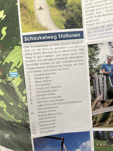 Read moreTolle Wanderung auch für kleine Kinder! Mit genügend Zeit und Jause ein super Erlebnistag. Laut Hinweistafel bei der Bergstation des Sessellifts ist der Rundweg nur 2,7 Kilometer lang und man benötigt laut Tafel ca. 2,5 Stunden. Das schafft man, wenn man jeweils nur ca. 10 Minuten Weg- und Aufenthaltszeit zwischen den 14 Stationen hat. Wir hatten durchschnittlich 20 Minuten Weg- und Aufenthaltszeit zwischen den Stationen. Mit unseren drei Spätzen (1, 3 und 5 Jahre alt) haben wir also gut 5 Stunden gebraucht.