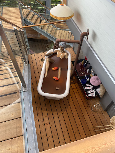 Spielplatz Am tiefsten Punkt des 27 ha großen Geländes liegt – teilweise im Wald – ein sehr spezieller Spielplatz mit Hängematten, Hängebrücke und einem kleinen Bach, der direkt dazu einlädt aufgestaut zu werden. Slacklines bieten ein etwas geordneteres Abenteuer, aber auf jeden Fall kommt Wald-Abenteuer-Flair auf, obwohl alles sehr sauber und in bestem Zustand gehalten wird. Die klassische Musik, mit der die Hängematten beschallt werden ist vielleicht nicht jedermans Sache, aber ich finde das Konzept einzigartig, entspannend und gelungen.