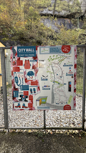 Salzburg City Wall is the grounds for via ferrata climbing in the centre of Salzburg. There are four climbing routes with different difficulty levels that will meet every climber's needs - from the short horizontal practice route to the "Kapuziner-Gams" route with overhanging "E" sections. The steel cable and fixations are thick and well maintained. An interesting feature are ladders near the top. All the routes end on a nice plateau which offers a place to rest and enjoy the view of Salzburg. The descent ends at Linzergasse. One can further go exploring the Kapuzinerberg or getting back at the bottom of the City Wall and...