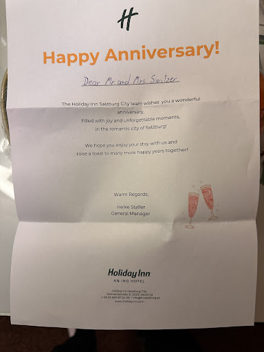 We stayed this hotel for 3 nights. The hotel has everything that you need but its a little bit outdated. Nice water pressure when take a shower. 15 min walk from main train station and 15 min walk from mirabellplatz. There are no restaurants immediately near the hotel, but if you buy Salzburg card the transportation is included, so it’s not really an issue (take a bus). Breakfast is 21 euros but a Mcdonalds is only a 10 min walk. There are many supermarkets nearby but they close on Sundays. It was a nice surprise when the hotel manager Heike Staller provided us with a surprise fruit tray on our anniversary. We thought that the staff were very friendly and accommodating. It was a good stay here.