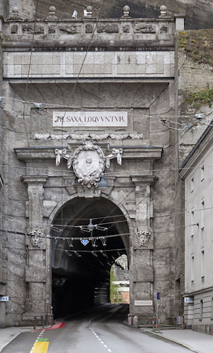 The Sigmundstor is a road that runs through the Mönchsberg Mountain that connects Old Town of Salzburg and the Riedenburg district. The tunnel is 135 metres long and engineered to have a gentle angle, allowing water to run out and light to penetrate deeper further into the tunnel. The entrance on the old town side bears an emblem with a portrait of Prince Archbishop Schrattenbach.