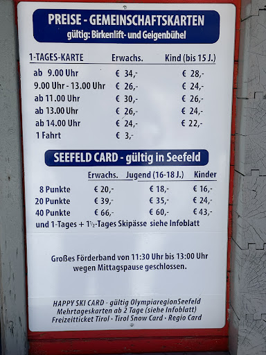 Read moreThe place most beginners learn to ski in Seefeld. A magic carpet or two, and a couple of drag lifts. Toilets at the bottom of both slopes, a little bar serving drinks and snacks with seating at bottom of Geigenbuhel and a cafe at the base of the Birkenlift. You can buy lift passes and points cards at both but they don't take credit cards so we walked to the ski school office from the...