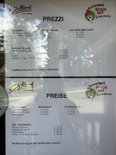 Frequentiamo il parco da anni ed è sempre stato un piacere andarci. Dallo scorso anno è diventato a pagamento, e questo puó essere comprensibile. Quello che non è accettabile è il prezzo: 12,50 euro per adulto e 7,50 euro per bambino! Come se un adulto potesse usufruire dei divertimenti del parco, quando invece entra solo per sorvegliare i figli (che peraltro da soli non potrebbero entrare). In più, se si vuole accedere al percorso del parco avventura, è richiesto il pagamento di un biglietto aggiuntivo (oltre a quello dell’ingresso) di 17 euro per adulto e 12 euro a bambino. Con la conseguenza che se si volesse andare solo al parco avventura, perché magari si hanno i figli grandi, si deve pagare il biglietto di ingresso PIÙ quello del percorso, cioè 30 euro a persona. Insomma, considerato che la zona offre moltissimi parchi gratuiti, forse anche più belli, non conviene proprio andare al Wichtel Park.