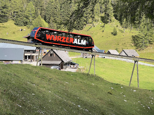 The funicular to the Wurzeralm is technically a land cableway with two cars moving on rails each in the opposite direction, which is single-track for most of its length and has a midway point with two switches for avoidance. It is not a rack-and-pinion track, as is sometimes stated. The Wurzeralm is a magical place in the mountains that can be easily walked around in about 1 hour (even with smaller children) or serves as a starting point for longer mountain hikes. There is a round trail with many information boards on interesting facts about the Wurzeralm. You can also take your bike up and ride down the Wurzeralm Singletrail. This is a trail marked as a red trail with a length of 5 km, on which you will lose about 600 m of altitude. From the point of view of experienced trails bikers, this is a rather easy trail (at least by Austrian standards). On the other hand, I definitely don't recommend it to inexperienced riders without proper equipment as bikes with dropper seatpost...
