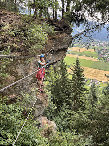 Wij deden vorige week 5 ferrata's in Slovenië en misschien zijn we daardoor wat verwend maar deze vonden we geen topper. Al zien we er wel de kracht en de veelzijdigheid van in. Vermits het onze laatste dag vakantie is en slechts een tussenstop in de rit naar huis deden we "maar" 2 sporen. De Nr 3 en de Nr 6 (rode route). Voor de Nr3 hadden we welgeteld 8 minuten nodig om van de start tot boven te raken. Maar we wilden deze zeker doen omdat hij over de brug ging. De Nr 6 duurde iets langer maar ging toch ook redelijk vlot. Over gans de wand zit je redelijk ingesloten door de bomen. Het is pas bijna op het einde dat je een beetje uitzicht krijgt. En dat vinden wij heel jammer. Wat wij zeker leuk vonden is het feit dat je hier wel voor iedereen wat wils hebt. Ben je nieuw in het via ferrata wereldje? Dan zijn er wat oefenstenen. En moet je nog wat wennen aan hoogtes als je dit doet? Dan is dit ook de perfecte plek voor jou. Eens je op de wand bent kan je vlot van het ene naar het andere spoor overschakelen. Heel de wand vonden wij zeer veilig afgewerkt. Zeer veel ijzeren ankers en eens boven is alles goed afgespannen. Beneden staat er zelfs een box met een first aid kit in!!! Aangenaam verrast ook dat er parking is voorzien speciaal voor mensen dat hier komen klimmen.