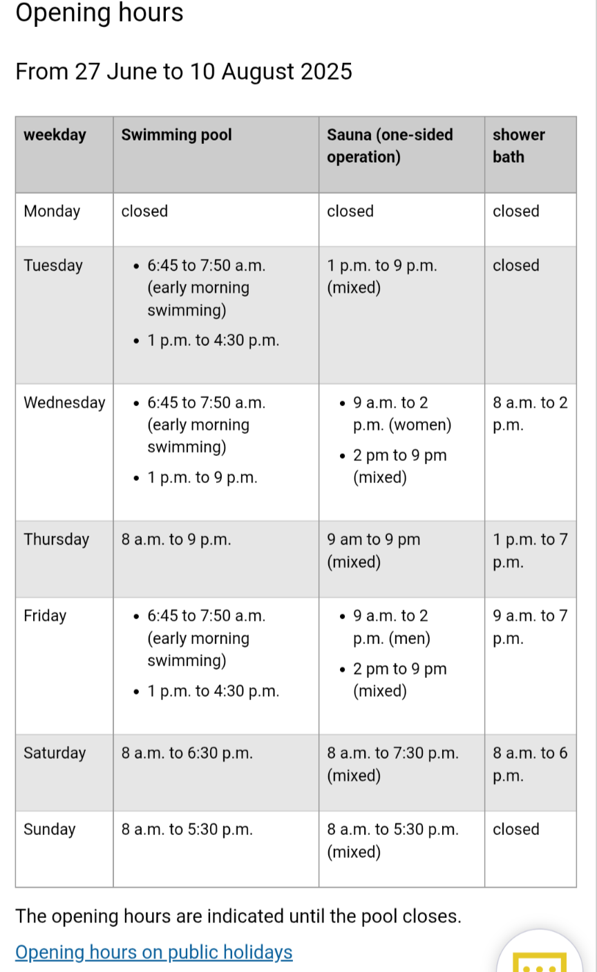 Read moreThis rating is NOT for the facility. This is for the woeful state of customer service — or the total absence thereof — in this most gorgeous of swimming holes. What an absolutely lamentable experience to have met perhaps two of the rudest, most abrupt and ill-mannered staff members working in a public service amenity. The cleaning lady who pounced on us should give a master class in how not to be behave towards paying customers (or to other people, in general)... The middle aged (50-60 yo) red-shirted man we approached to say “I’m here to sign in” didn’t even let look up but instead cut me off with “nein, nein, nein...” I was transported to that time I inadvertently sat next to a couple of neo-Naz**. I hope he is not a permanent employee in any position of authority. Wow. RUDE. I didn’t have the energy except to politely restate, and again the response was “nein nein nein ”. I just can’t even! Wow. There’s some kind of cognitive issue there. I would hate for him to be a swimming instructor (scary!). If he is a contractor affiliated with a swimming school, well, I’m sure his day will come when a less controlled, polite customer or parent will have words with him. Oh dear.