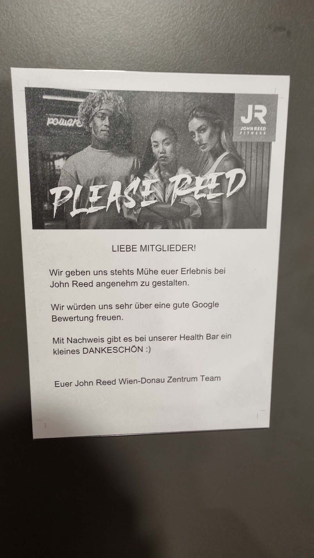 Read moreSehr gut ausgestattetes und cooles, neues Studio. Personal immer sehr freundlich und hilfsbereit. Die verschiedenen Abo-Optionen bieten Trainingsmöglichkeiten fĂŒr jeden Geldbeutel. Das Studio besitzt neben einem groĂen Krafttrainingsbereich mit GerĂ€ten, eine Cardioecke, einen Core-Raum, Freihantelbereich, Cyclingraum und Functional Area, sowie Sauna und kleiner Whirlpool. Ich habe vor dem John Reed viele Jahre in einem Premiumstudio im 1. Bezirk trainiert, wo es weder diese Auswahl an TrainingsgerĂ€ten gab, noch die Freundlichkeit vorhanden war, so dass ich im dieses Studio wirklich wieder sehr gerne mehrfach die Woche trainieren gehe. Einen Punkt Abzug gibt es leider fĂŒr das oft sehr gut besuchte Studio, was teils zu leichten Wartezeiten im Training fĂŒhrt, jedoch verkraftbar ist :-)