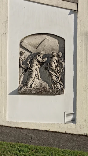 Die hufeisenförmig ansteigenden Stiegenaufgänge tragen an der inneren Seite Steinreliefs, die einen Kreuzweg der Bildhauer Franz Abel und Paul Paintl zeigen; von denen auch die im Inneren der Kirche befindlichen Kreuzwegbilder stammen. Links neben dem Kircheneingang befindet sich das Porträt des Stifters Esders.