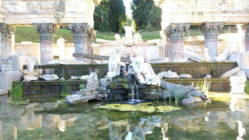 The Roman Ruin consists of a rectangular pool enclosed by a massive arch with lateral walls, evoking the impression of an ancient edifice slowly crumbling into the ground. In the pool in front of the ruin is a seemingly haphazard arrangement of stone fragments supporting a figural group which symbolizes the rivers...