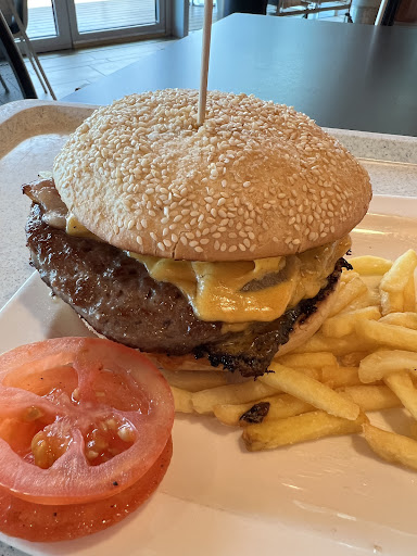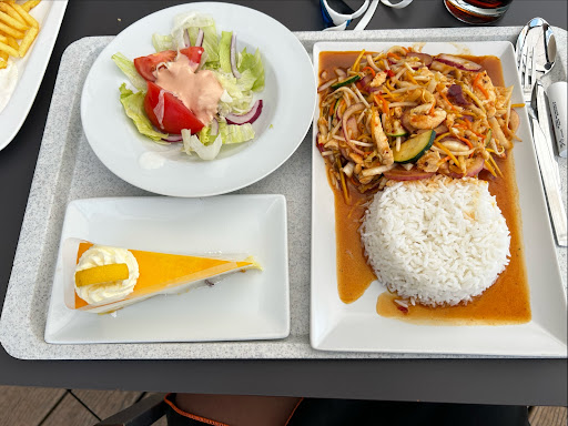 We ate at the restaurant in the building, there are various options you can choose from. The chicken work with rice is €16, the same goes for beef burger. The portions are really big. The salad is costed by weight. Overall we spent €50 including 3 glasses of soft drinks and one lemon cake.