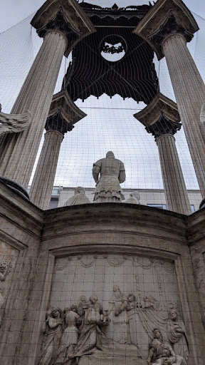 Here you can see an allegorical composition of figures made of white marble. In the centre is a priestly figure overlooking a man and woman touching hands. There are four columns supporting a decorative bronze crown-like structure above them. Fountain basins were expectedly empty during my early March visit.