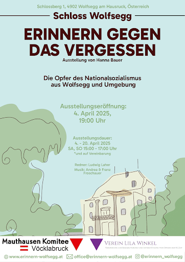 Die feierliche Eröffnung der Ausstellung „Erinnern gegen das Vergessen“ im Schloss Wolfsegg am 4. April 2025 war ein eindrucksvolles und bewegendes Ereignis. Mit großem Engagement wurde daran erinnert, dass die Opfer des Nationalsozialismus aus Wolfsegg und Umgebung nicht in Vergessenheit geraten dürfen. Die von Hanna Bauer konzipierte Ausstellung wurde durch den Schriftsteller Ludwig Laher, den Künstlerehepaar Andrea und Franz Froschauer sowie dem Mauthausenkomitee Vöcklabruck und dem Verein Lila Winkel eröffnet. Viele hier ungenannte haben das Projekt tatrkäftig unterstützt.