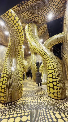 Fantastic venue for the Yayoi Kusama, You, Me & Thé Balloons exhibition. Staff are extremely helpful and friendly. The exhibition itself is housed in a large warehouse style room with zones to lose yourself in momentarily. Starting in a psychedelic yellow and black spotted room, you emerge onto a raised platform you can view the landscape of the ensuing artworks. You see the artist herself projected onto a screen reciting words in Japanese repetitively yet it is weirdly not annoying and just slides into the overall experience. The translation is provided in the pamphlet you are handed at the beginning. Descend to the ground floor and feel dwarfed by huge inflatables. Lie on clouds, check out the reflection of the surroundings on huge mirrors, queue to view a polka dotted wonderland and run amongst a pink and black wonderland. The most underwhelming part is queueing for the red and white polka dot infinity style room. Seeing her past works, I know how wondrous these spaces can feel - this wasn’t it. More suspended dots and a mirrored floor probably would have made this better. All in all, a great way to spend an hour or more. We could have spent a long time in there but the exhibition closed, lights came up and we were kicked out into the mundane world of concrete and grey skies.