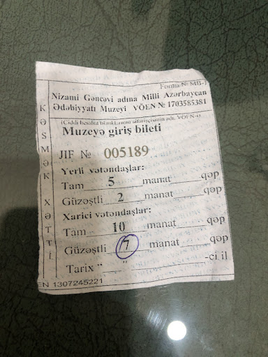 Beautiful exterior. We entered through the wrong door initially, were then redirected. After walking through a metal detector manned by a guard preoccupied with his phone, the coat check stopped us, as that is where we were to buy our tickets. I asked for our tickets in Russian, they had told us they cost 7 monat each. After handing over a 20 note, they asked for our nationality. We had told them we are American, at which point they had upcharged us 10 monat each. After unhappily agreeing to the price, they had asked us to cover our shoes with plastic booties, surrender our hand bags, as well as given instructions on our mobile phone usage. I became annoyed by the upsale then being ordered around on petty matters before seeing anything, so I asked for a refund, to which they obliged. I had heard wonderful things about Azeri literature and hoped to learn more at this museum. Nothing more than a curiosity for my education. Unfortunately, I was greeted with an upcharge and a string of commands...