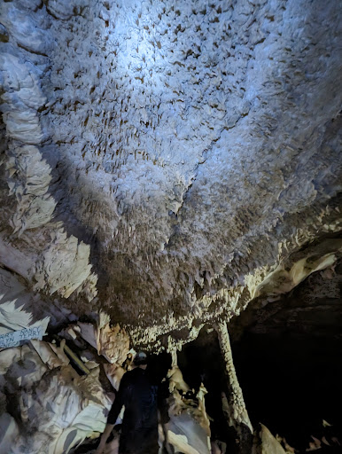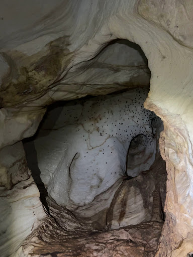 Exploring Hatchet Bay Cave felt like stepping into another world—dark, silent, and surreal. The first sublevel was eerily quiet, with no echoes, just the crunch of footsteps and whispers of the past etched into the walls. Graffiti and name carvings dating back to 1898 gave the cave a haunted sense of history. With a black light headlamp, hidden neon-like mineral markings came to life, glowing mysteriously in the darkness.