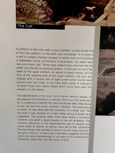 وكان يعتبر المعبد في نظر أهل قرية باربار من الأشياء المقدسة التي يذهبون إليها لإلقاء القرابين حتى تتحقق أحلامهم، يؤدي هذه البئر إلى مجمع يطلق عليه “الآلهة”، يحتوي على عدد من التماثيل الأثرية تجسد ملامح للإله إنكي وزوجته نينهورساغ.
